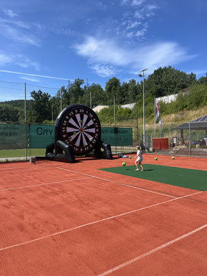 Nach der Offiziellen Ansprache des Vorsitzenden, Marc Geurten, konnten die Gäste und Mitglieder des TC Nickenich sich an verschiedene Stationen; Fußballdart, Aufschlagmeßgerät, Ballmaschine und Tennispong ausprobieren. Für die Kinder stand eine große Hüpfburg bereit.